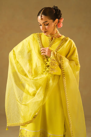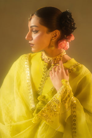 A luminous shirt adorned with sequin embroidery, paired with a delicately embroidered organza dupatta and intricately detailed trousers.