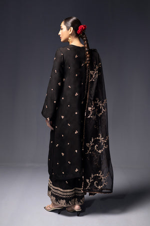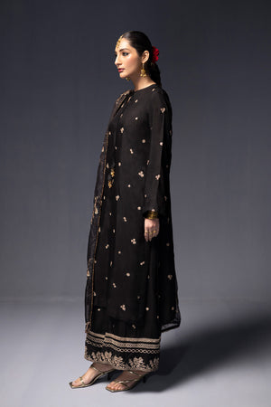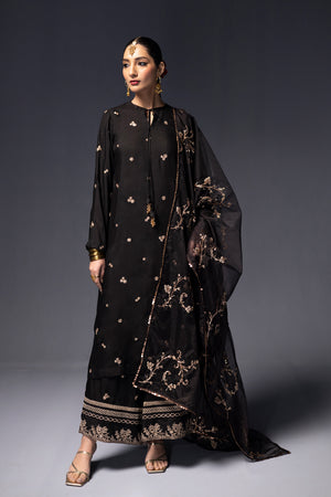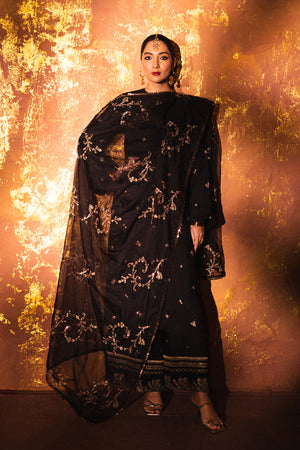 A long silk embroidered shirt with delicate tassels at the front is paired with wide-legged trousers featuring intricate embroidery at the hem. The ensemble is completed with an organza dupatta embellished with glimmering gold embroidery and finished with sequin lace on all four sides.