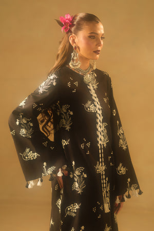 A mesmerizing long shirt, adorned with delicate sequin embroidery, exuding understated luxury. Paired with cotton trousers and a sheer embroidered organza dupatta that drapes like poetry, this ensemble is an ode to effortless grace.