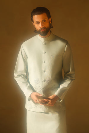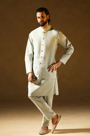 A sophisticated kurta pajama set, complemented by a matching waistcoat adorned with delicate sequin embroidery—an understated statement of elegance and grace.