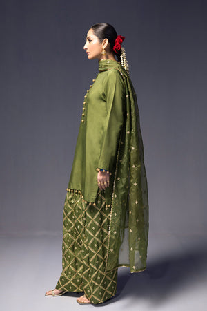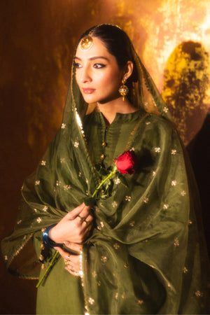 An elegant olive green silk set featuring an embroidered shalwar adorned with intricate golden patterns. The shirt is detailed with golden embellishments on the neckline, sleeve cuffs, and hem. Completing the ensemble is an organza dupatta, beautifully embroidered and bordered with shimmering sequin lace on all four sides.