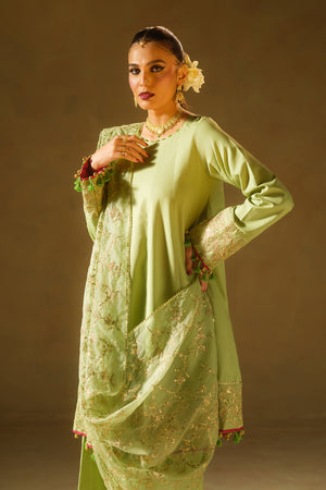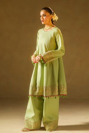 A pistachio green ensemble featuring a short flared shirt with intricate embroidery on the sleeves and hem. Paired with a matching shalwar, adorned with delicate embroidery on the hem, this look blends tradition with effortless grace.