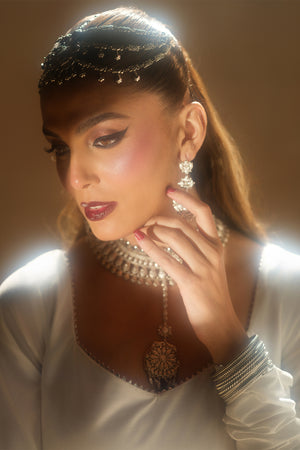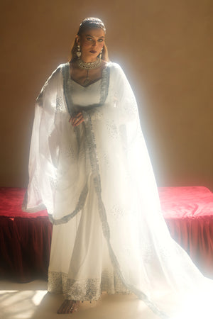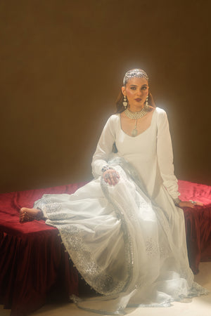 A white pishwas paired with a chooridar pajama, featuring an embroidered organza dupatta. Delicate embroidery on the hem adds a subtle shimmer, completing the look with effortless grace.